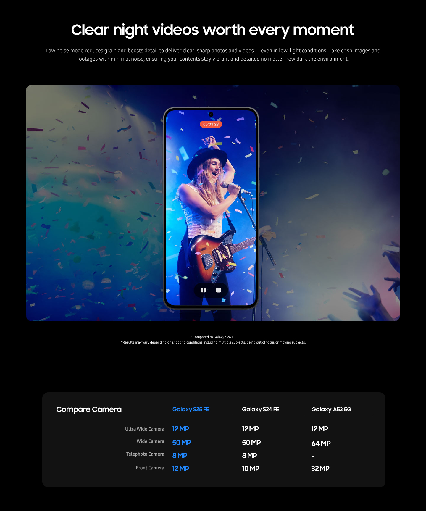 | Front Camera : 10MP, 1.22um, F2.4 4K 60FPS Rear Camera : Wide : 50MP with OIS, 1.0um, F1.8 Ultra Wide : 12MP, 1.12um, F2.2 Tele : 8MP, 1.0um, F2.4 Vid : 8K 30FPS, 4K 60FPS |