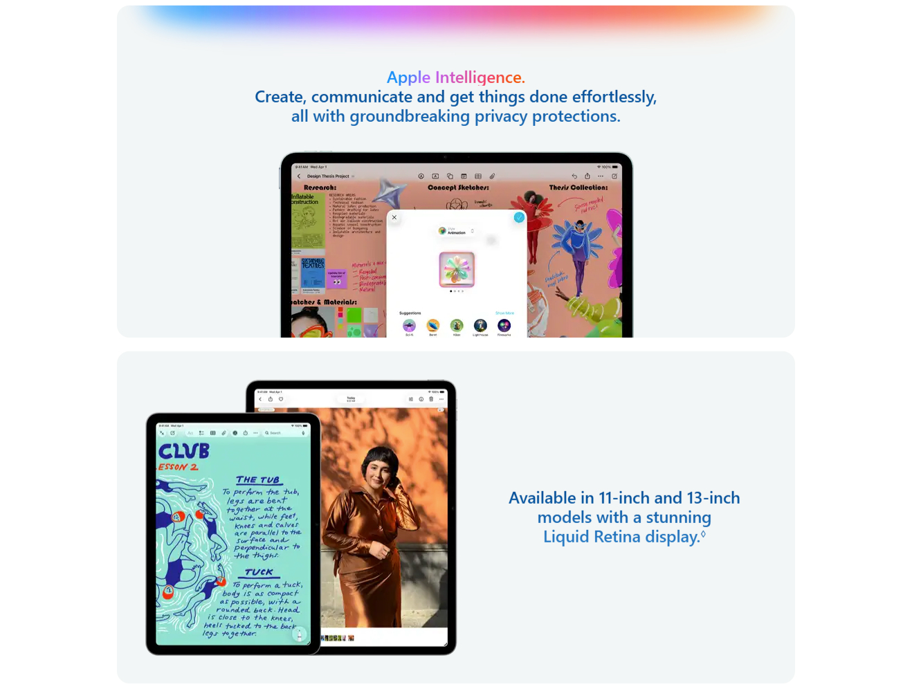 | Liquid Retina display, LED backlit Multi-Touch display with IPS technology 2360-by-1640-pixel resolution at 264 ppi |